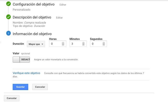 Su configuración es muy sencilla, solo tenemos que especificar el tiempo que el usuario debe estar en nuestra página para cumplir el objetivo.